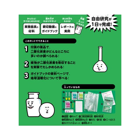 動画でわかる! 自由研究おたすけキットシリーズは、実験用の器具や材料のキットと、実験方法や手順を詳しく紹介したガイドブック、自由研究のまとめ方がバッチリわかる実例レポートがついた夏休みの自由研究に適したキットです。