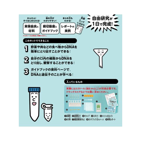 「DNAを調べよう」は、身近な食品や自分の口腔細胞からDNAをとりだせるキットです。