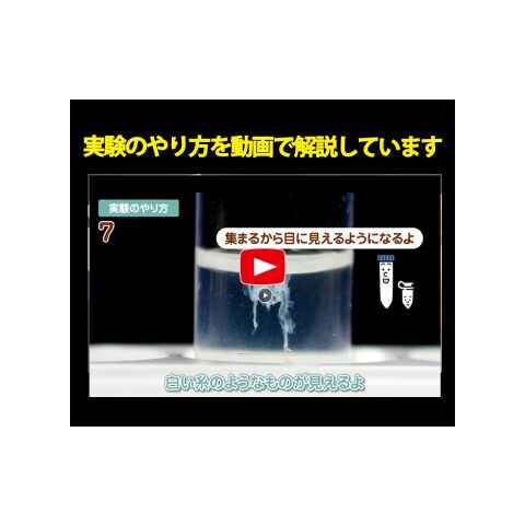 電子顕微鏡でしか見えないほど小さいDNAですが、付属の薬品で細胞の核からとりだし、たくさん集めると肉眼で見えるようになります。