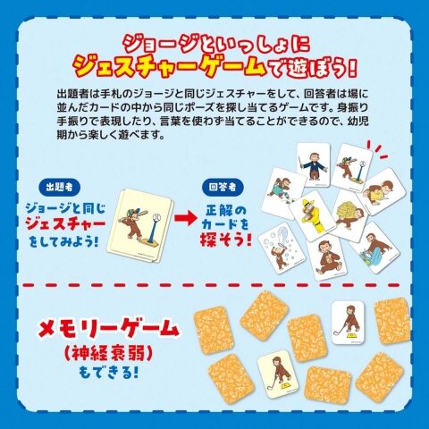 出題者は手札のジョージと同じジェスチャーをして、回答者は場に並んだカードの中から同じポーズを探し当てるゲームです。