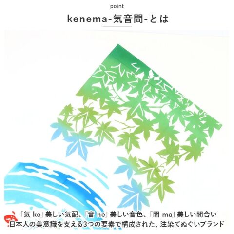 ◆kenema-気音間-とは、「気 ke」美しい気配、「音 ne」美しい音色、「間 ma」美しい間合い。日本人の美意識を支える3つの要素で構成された、注染てぬぐいブランド。
