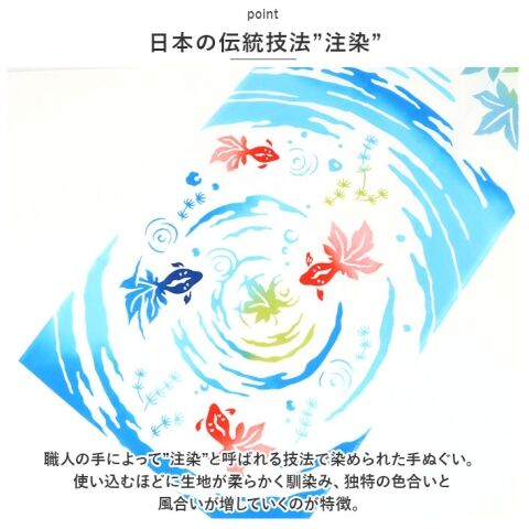 ◆職人の手によって”注染”と呼ばれる技法で染められた手ぬぐい。使い込むほどに生地が柔らかく馴染み、独特の色合いと風合いが増していくのが特徴。