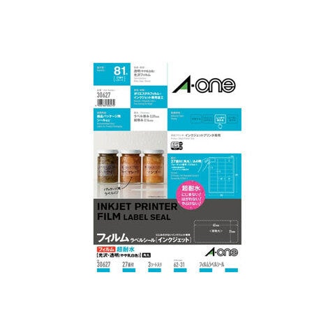 エーワン ラベルシール[インクジェット]超耐水タイプ光沢フィルム・透明(やや乳白色) A4判 27面 30627 【返品種別A】