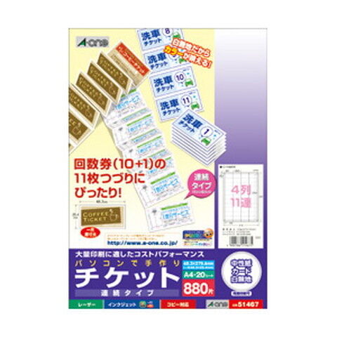 エーワン パソコンで手作りチケット ホワイト A4判 44片 連続タイプ 51467 【返品種別A】