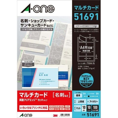 エーワン マルチカード 各種プリンタ兼用紙 A4 10面 10シート入り(アイボリー) 両面クリアエッジタイプ 標準厚み 51691 【返品種別A】