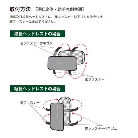 ※縫製されているゴムやヒモは、取付け時に無理に引っ張らないでください。破損の原因になります。