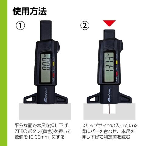 タイヤ溝ゲージ 最大測定値:約25mm、測定場所はタイヤの「スリップサイン表示マーク」が目安です。