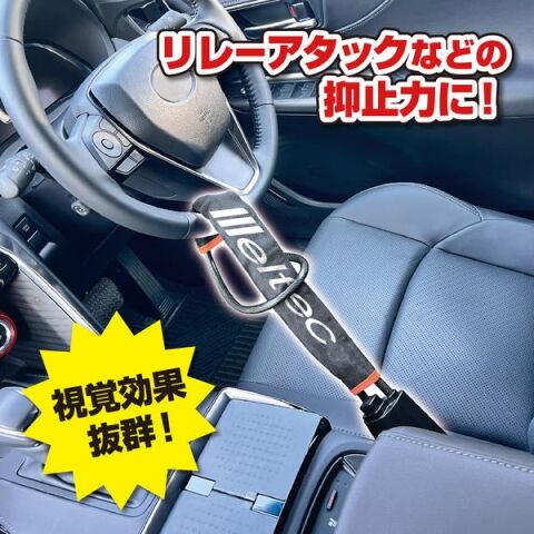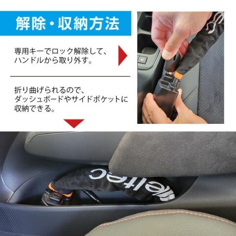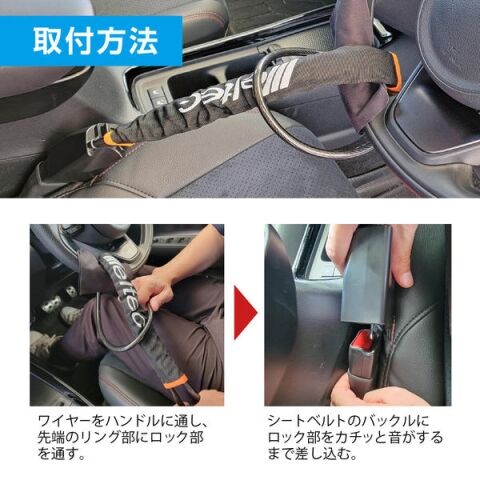 ハンドルの内側に通し、シートベルトのバックルに差し込むだけ