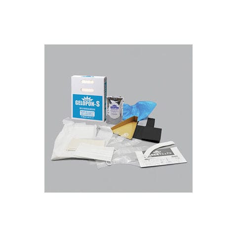 - セット内容:外箱(チリトリ兼用)1個、嘔吐物凝固剤1袋(100g)、ペーパータオル1組、ヘラ1個、ポリ手袋1双、手提げポリ袋1枚、マスク1枚、靴カバー1組、キャップ1枚、エプロン1枚、イラスト付マニュアル1部