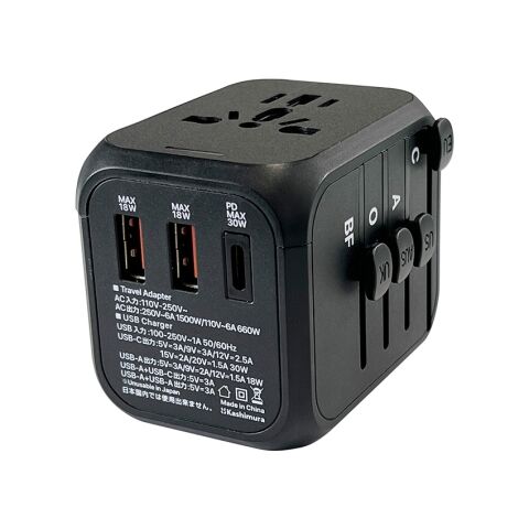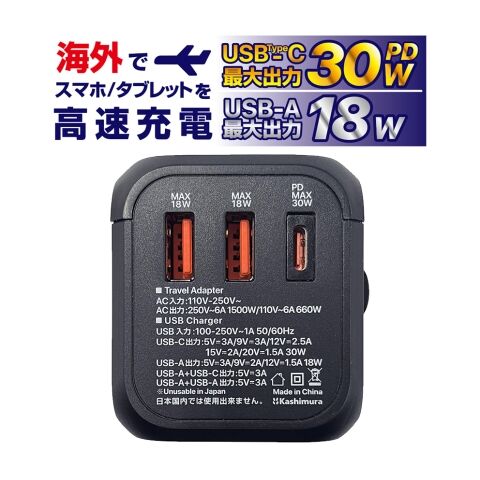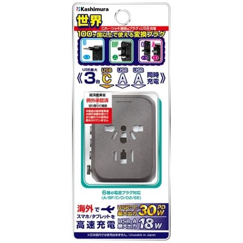 カシムラ 海外用変換プラグ(AC×1個口+USB-A×2ポート、Type-C×1ポート) 黒利用可能地域:北米・欧州・オセアニア・アジアなど Kashimura WP-109M 【返品種別A】