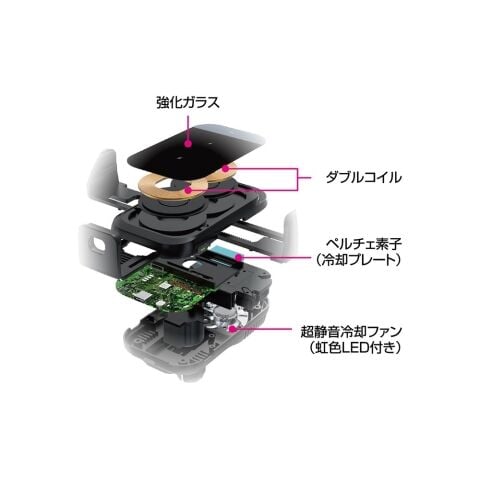 ◆3重冷却構造、充電しながら放熱可能。(充電器表面に強化ガラス採用、ペルチェ素子内蔵、冷却ファン付き。)