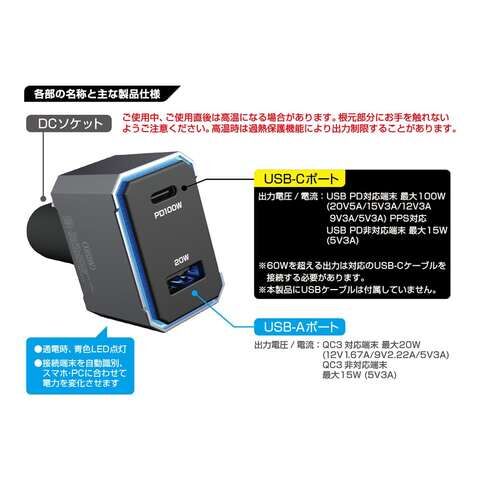 - 出力 同時使用時:【2ポート同時】C最大100W A最大20W / 合計最大120W