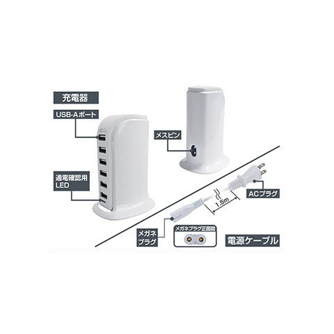 - 出力:1ポート最大DC5V 2.4A / 6ポート合計 最大DC5V 8A