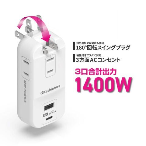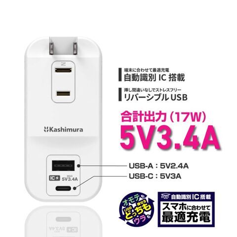 カシムラ Type-C1ポート/USB1ポート+3コンセント 電源タップ 自動識別 リバーシブル 計3.4A Kashimura AC-066 【返品種別A】