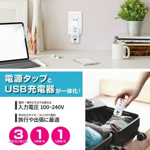◆3口のACコンセントとUSB Type-Aポート+USB Type-Cポート搭載の電源タップ。