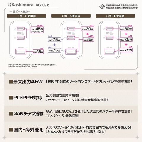 カシムラ PD45W対応 Type-C2ポート/USB1ポート AC充電器(ホワイト) AC-076 【返品種別A】