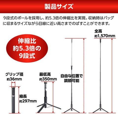9段式のポールを採用し、約5.3倍の伸縮比を実現。