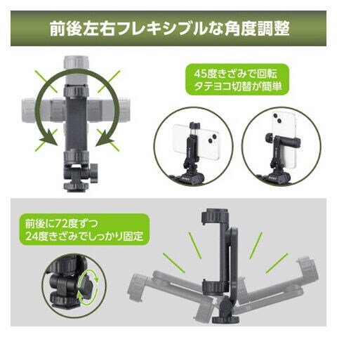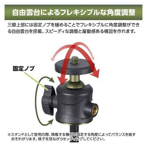 三脚の上部には自由雲台が取り付けられており、フレキシブルかつスピーディーに調整することが可能です。