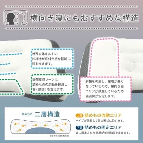 ◆頸部支持ゾーンは詰めものが流動して首の形状に沿う上層部分と、底の部屋が詰めものを固定し首(頸部)をしっかり支える下層部分の二層構造です。