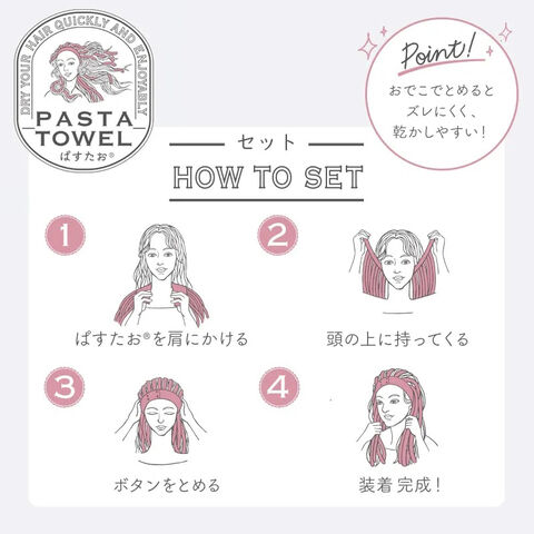 シャンプー後「ぱすたお」をセットし、濡れた髪をやさしく揉みこみます。