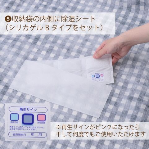 ◆収納時の湿気からまもる除湿シート付。天日で干すなどで吸湿力が回復するシリカゲルBタイプを使用しています。