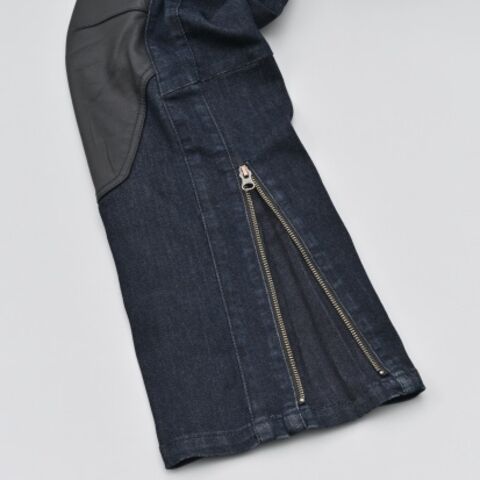 ◆レザー補強がアクセントのバイク専用ヒートガードデニム。