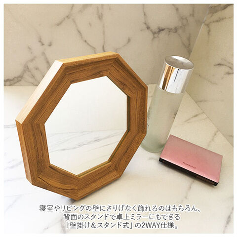 寝室やリビングの壁にさりげなく飾れるのはもちろん、背面のスタンドで卓上ミラーにもできる「壁掛け&スタンド式」の2WAY仕様。