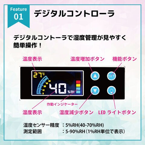 - 湿度計:デジタル温湿度計(湿度コントローラー付き) ※電池不要