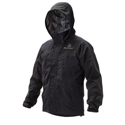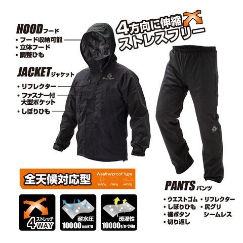 ◆上着は、水の侵入を防ぐ前たて、収納可能な立体フード(調整ひも付き)、裾部分には絞りヒモ付きで下からの雨・風の侵入をブロックします。