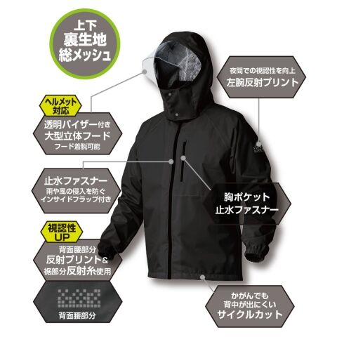◆上着は、着脱可能な透明バイザー付き大型立体フード(ヘルメット対応)、左胸に止水ファスナー付きポケット、背面腰部分と左腕に反射プリント、かがんでも背中が出にくいサイクルカット仕様と機能満載!