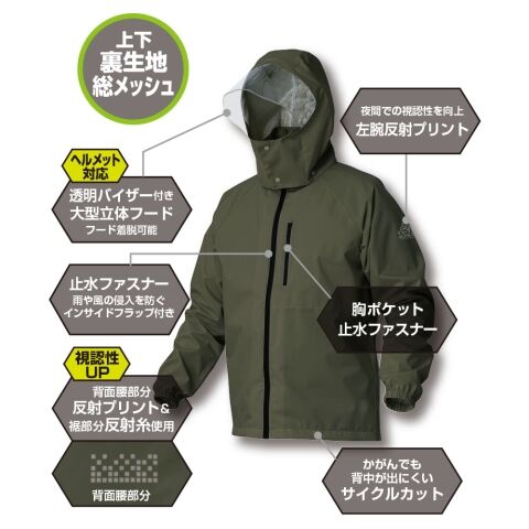 ◆上着は、着脱可能な透明バイザー付き大型立体フード(ヘルメット対応)、左胸に止水ファスナー付きポケット、背面腰部分と左腕に反射プリント、かがんでも背中が出にくいサイクルカット仕様と機能満載!
