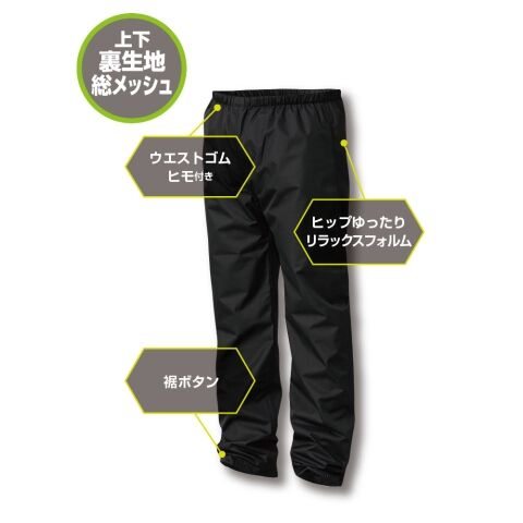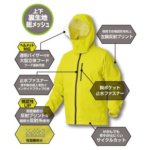 ◆上着は、着脱可能な透明バイザー付き大型立体フード(ヘルメット対応)、左胸に止水ファスナー付きポケット、背面腰部分と左腕に反射プリント、かがんでも背中が出にくいサイクルカット仕様と機能満載!