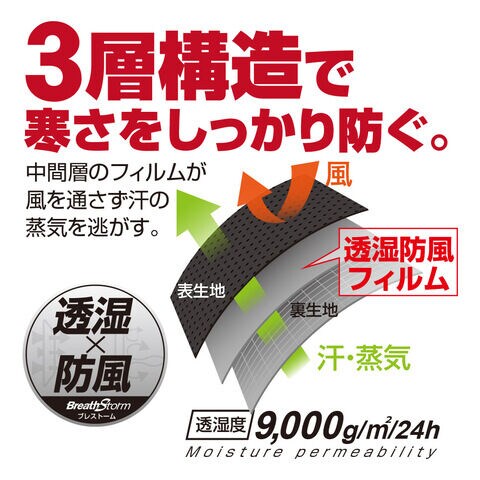 ◆風を通さず蒸れを抑える、透湿度9000g/m2/24hの透湿・防風フィルムを採用しています。