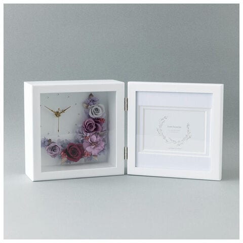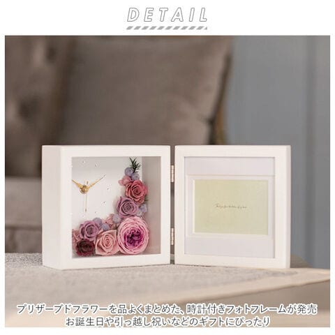 ◆お部屋を華やかに彩るインテリア♪プリザーブドフラワーを品よくまとめた、時計付きフォトフレームが発売。