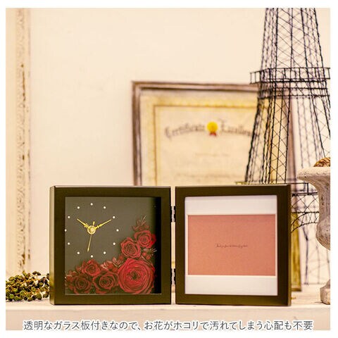 - 注意書き:フック等を使用する場合は、製品の重さに耐えられるかどうか壁の素材、強度等にもご考慮下さい。必ず使用するフック等の取扱説明書をお読み下さい。製品を吊る場合、吊りヒモ等は長期間そのままご使用されますと、品質劣化により切れることがあります。ヒモ、ワイヤーまたは、吊り金具のガタ、腐食等の異常がないかを点検し、異常がある場合には交換して下さい。少なくとも年に一度は点検して下さい。予期せぬ事態で製品が脱落することも予想されます。製品の下には大切なものや家具、陶器等を置かないようにして下さい。ガラスの使われている商品は衝撃によって割れる恐れがありますので取り扱いには十分ご注意ください。[掛け具について]掛ける場所に合わせた掛け具をご使用ください。掛ける時は、時計を上下左右に軽く動かし、外れないことを確認してください。掛け金具は、ポスターフレームや時計専用のJ型になっているフックをご使用下さい。紐がしっかりかかるものをご使用下さい。掛からないと脱落・落下の恐れがあります。[プリザーブドフラワーの取り扱いについて]水やりは厳禁です。水に濡れないような場所でご鑑賞ください。自然の花を加工した繊細なお花です。花びらは非常に壊れやすいのでできるだけ花びらに触れないようにしてください。プリザーブド溶液には油分が多く含まれているため、火気に近づけすぎないようご注意ください。高温多湿、直射日光は花弁の色褪せや劣化の原因となりますので、なるべく避けてください。湿気が多いと色移りしたり、花びらが透明になってきたりします。湿気の少ないところに移動させてください。乾いてくると元の状態に戻ってきます。プリザーブド花材がドレスや洋服・布地などに直接接触するようなご使用は避けてください。小さなお子様が口に入れないようご注意ください。カメラやモニターの性質により、画像と実物の色の違いがある場合がございますのでご理解願います。