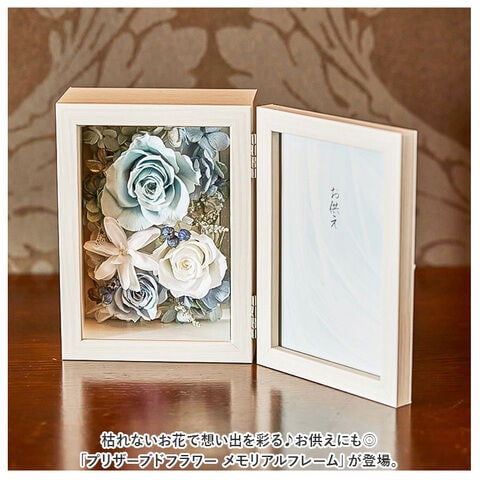 写真とお花を一緒に飾れるので、お仏壇などに置いても華やかな印象。フラワーアレンジメントと、フォトフレームが一体なので飾りやすい。