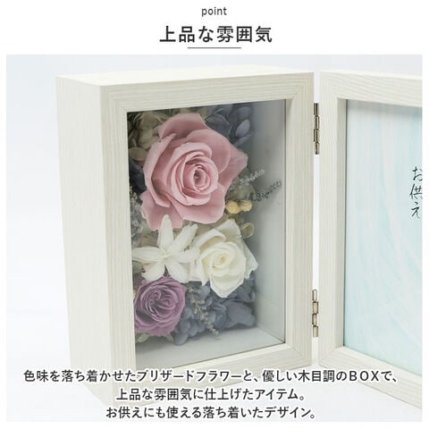 色味を落ち着かせたブリザードフラワーと、優しい木目調のBOXで、上品な雰囲気に仕上げたアイテム。お供えにも使える落ち着いたデザイン。