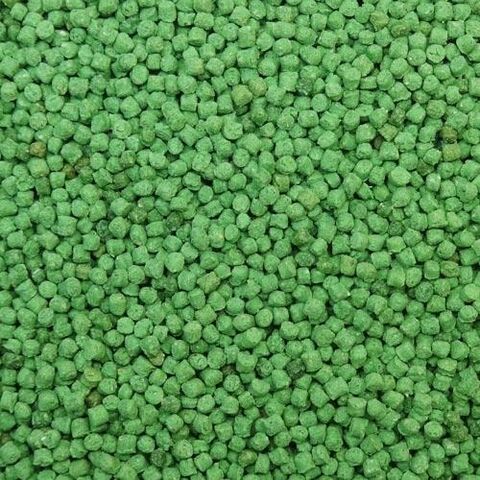 小麦粉、ホミニーフィード、脱脂大豆、米糠、粟粉末、小松菜粉末、ブドウ糖、魚粉、植物性油脂、オリゴ糖、乳酸菌(フェカリス菌)、ミネラル類(炭酸カルシウム、第二リン酸カルシウム、食塩、硫酸亜鉛、硫酸銅、ヨウ素酸カルシウム)、着色料(黄4、青1)、アミノ酸類(DL-メチオニン、塩酸L-リジン)、ビタミン類(E、ナイアシン、コリン、C、パントテン酸、B2、B1、イノシトール、A、B6、葉酸、K、D3、B12、ビオチン)