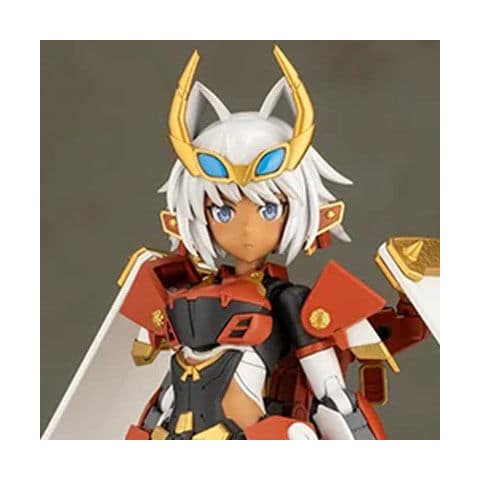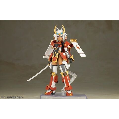 完全新規のフレームアームズ・ガールです。 塗装済みの顔パーツが5種付属。(「通常顔」「笑顔」「叫び顔」「マスク通常顔」「マスク叫び顔」) 兜、背部の旗印等をはじめとした特徴的なデザイン。朱色と黒色、金色を基調としたカラーリングが一際目立ちます。 素顔状態とマスク状態が再現可能。 素体状態と武装状態が再現可能。 髪型はエアダクト型髪の毛の有無が差し替え再現可能。 付属装備として日本刀大小(来国長、星月夜政宗)、長銃、短銃(掌式滑空砲(長銃/短銃))が付属。 背部バックパックを基部とした旗印状のウィングは、自由に可動し肩装甲や旗印、ウィングなど大きくシルエットを変える事が可能です。 各部マーキング、瞳のデカールが付属。 PVC製手首が左右それぞれ5種付属。 PVC製の手首の為、既存M.S.Gシリーズ、フレームアームズシリーズ等の武装を持つ事が可能。 各部に配置された3mm径のジョイントにより既存「M.S.G」「フレームアームズ」「メガミデバイス」「ヘキサギア」「創彩少女庭園」「アルカナディア」シリーズ等と各部併用が可能。