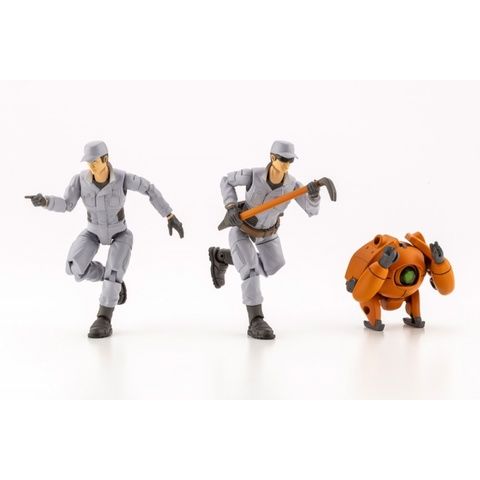 エンジニア本体は2体セットとなります。頭部は素顔とゴーグルありの2タイプになります。首は前後への可動ギミックがあり自由な表情付けができます。 工具は「ヘキサグラムリムーバー」「インパクトドライバー」「溶接バーナー」「バール」「工具箱(持ち運び用)」「工具箱(展開用)」「腰袋」が付属します。 エンジニアの手首はPVC成型となり、接続方式を軸タイプに致しました。 エンジニアの腰に取り付けるための腰袋が付属します。 手首は新規造形の「持ち手」「平手」「指さし」「サムズアップ」の4種が付属。接続方式は軸接続となっています。 ブーツ部分はアーリーガバナーVol.1の流用パーツとなります。 ドロイドは腕や脚が可動する他、中央のアイセンサーの可動によって視線を変更することができます。 エンジニアの成型色は「ライトグレー」「フレッシュ」「ダークグレー」「ブラウン」 の4色成型、ドロイドはオレンジ(フォークリフトオレンジVer.と同色)、クリアーグリーン、ダークグレーの3色成型、工具はオレンジの単色成型となります。