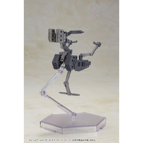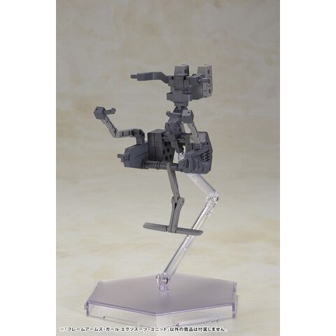 「エグゾスーツ・ユニット」は、フレームアームズの腕部と脚部を接続する軸と、フレームアームズ・ガールを座らせる事のできる腰部マウント&背部アームと、脚部脚置き、腕部用のコントロールアームで構成されています。