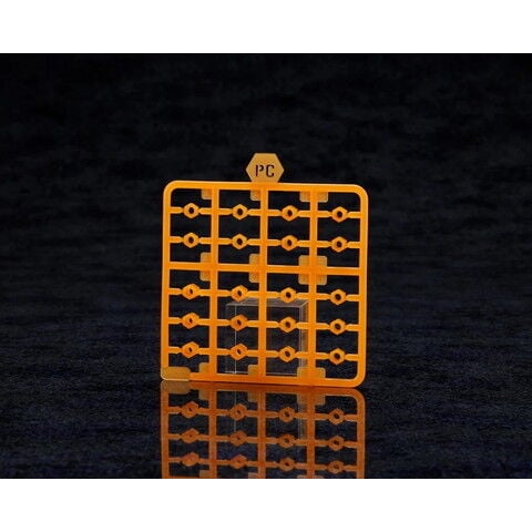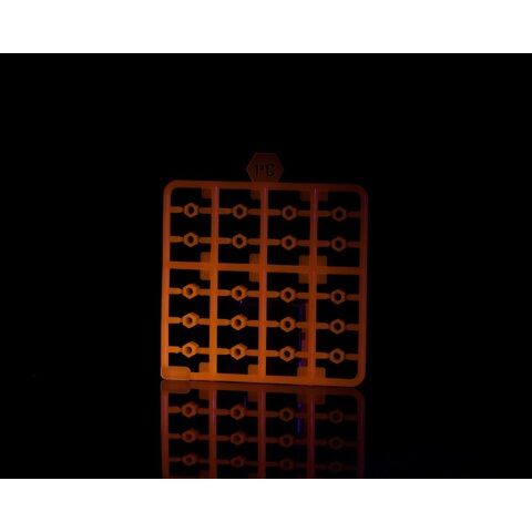■ヘキサギアのブランドカラーであるオレンジで成型されたヘキサグラムは、半クリアー成型とする事でガンメタルのフレームをはじめとした暗色の部品に装填してもしっかりとした発色を保ちます。