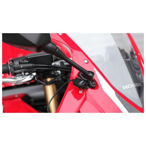◆フロント側はカウルミラー付根のボルトとの共締め、リア側はナンバープレート固定用ボルトと共締めし、ドライブレコーダー用のカメラを装着する為のステーです。