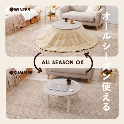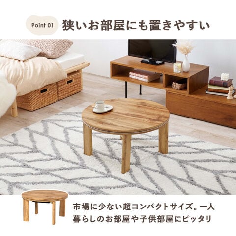 狭い部屋にも置きやすいコンパクトな円形コタツ。脚は折りたたんで隙間に収納も可能。