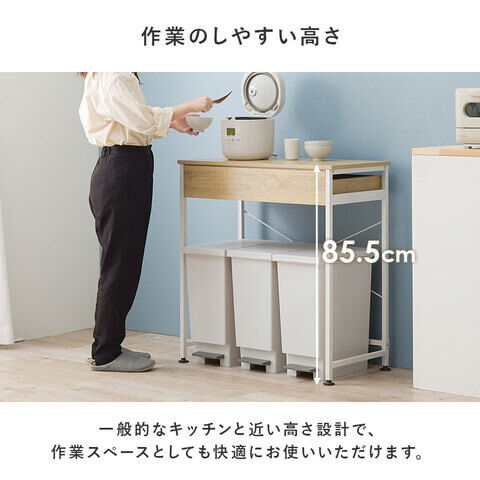 ◆引出し付きでストック品やカトラリーを収納可能。