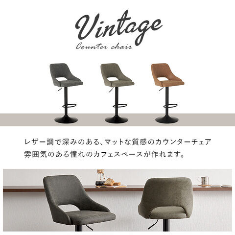 ◆マットな質感のヴィンテージ調の張地を使用した昇降式カウンターチェア