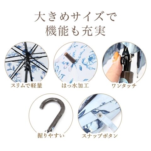 ◆親骨の長さ約65cm、傘生地を広げた時の直径約113cmと女性用長傘としてはしっかり大きめサイズ。肩に掛けたバッグやコートの裾も濡らしにくい嬉しいサイズ感。