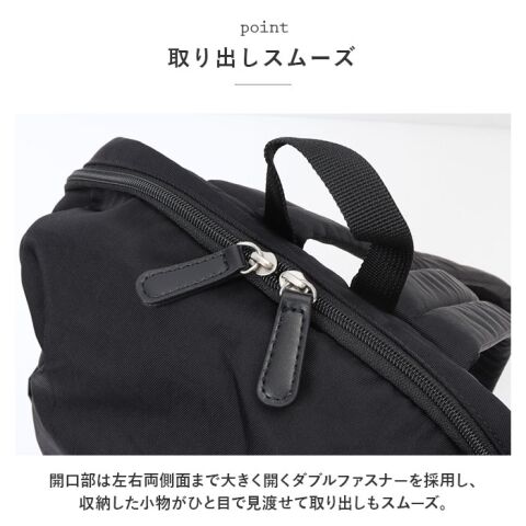 開口部は左右両側面まで大きく開くダブルファスナーを採用し、収納した小物がひと目で見渡せて取り出しもスムーズ。