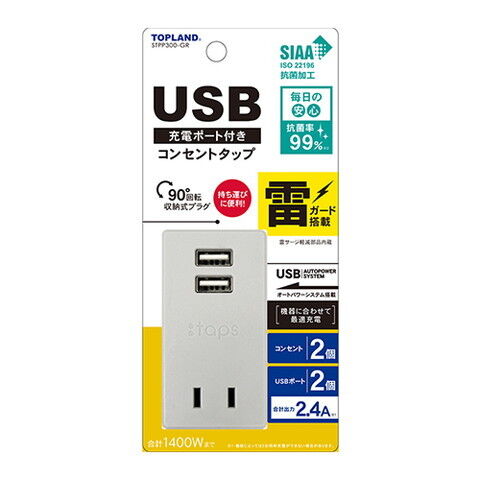 トップランド USB付きスマートタップ(2個口+USB2ポート)グレー TOPLAND STPP300-GR 【返品種別A】