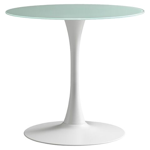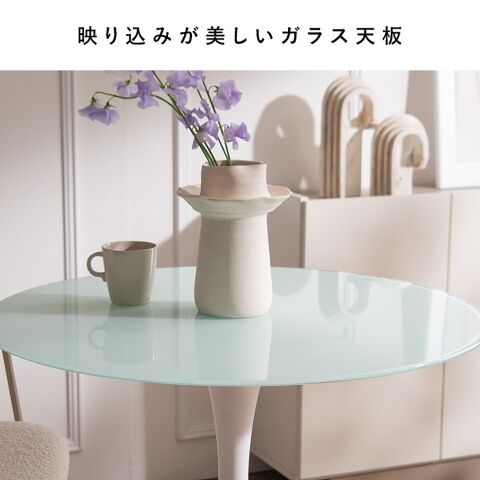 ◆反射や映り込みが美しいガラス天板と曲線を描く一本脚が特徴のラウンドダイニングテーブル『Rivelle(リヴェル)』。